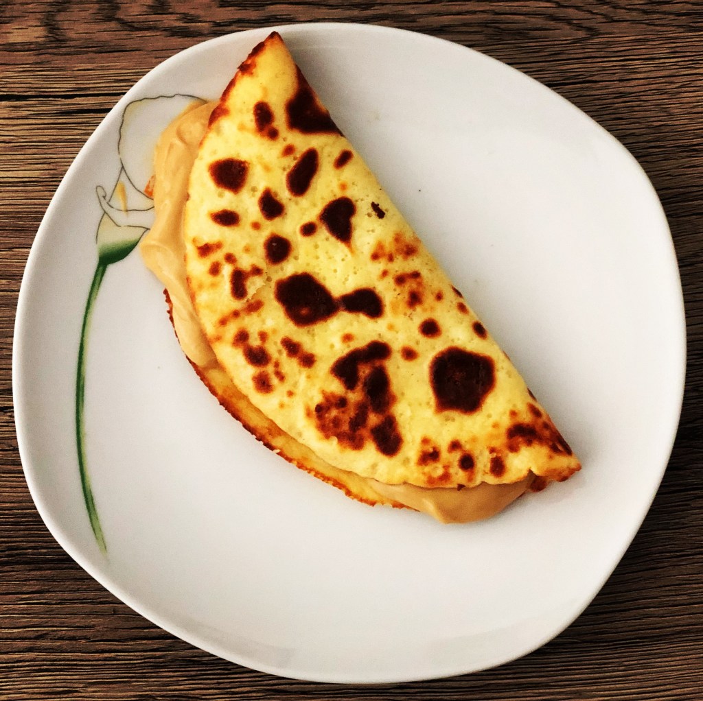 These crepes are quick and versatile, I sometimes make them sweet, and sometimes savoury. The one in the photograph is filled with caramel protein pudding 🙂